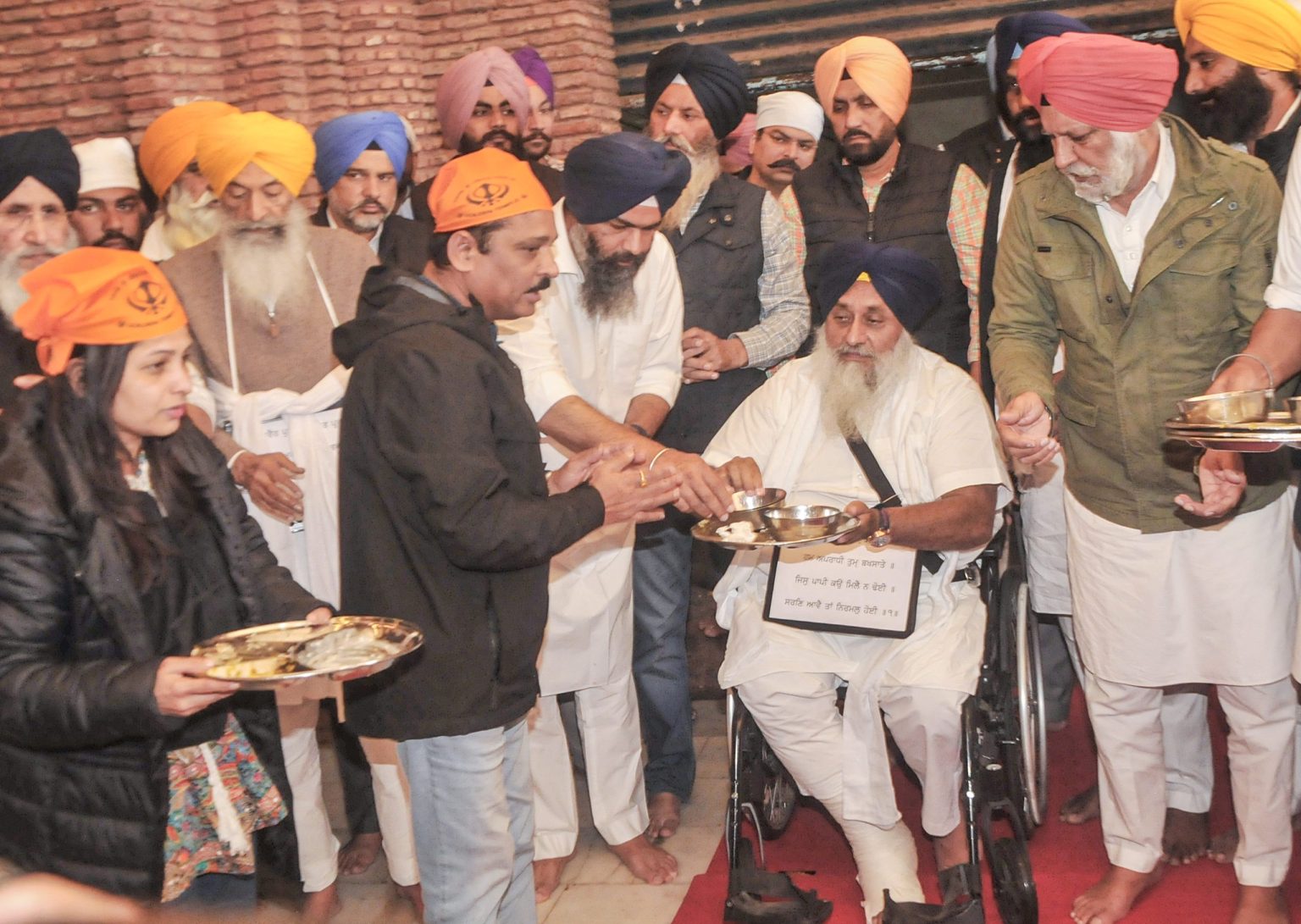 Akali leader Sukhdev Singh Dhindsa, who was also in a wheelchair because of his age, underwent the same punishment, while former Punjab ministers Bikram Singh Majithia and Daljit Singh Cheema washed utensils. Small boards hung around the necks of Badal and Dhindsa, acknowledging their “misdeeds”. Both leaders served as ‘sewadar’ for one hour.